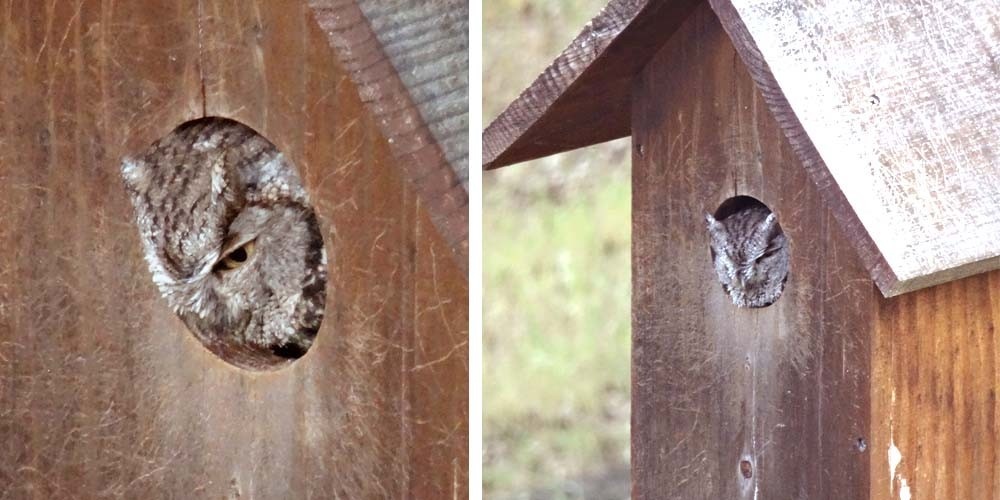 I often heard the sweet whistling hoots of Western Screech Owls nearby (they don’t actually screech…click here to listen to their call), yet the owl box stayed vacant for a few years. Then, at dusk on Mother’s Day, I had a distinct urge to go look at the owl box. I was greeted by a stunning owl looking straight at me. I delighted in watching her and her 2 owlets that Spring.